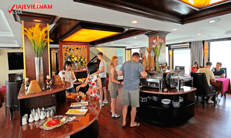 9:45 Disfruta brunch de despedida que se sirve en el restaurante. Podría observar las escenas desde diferentes ángulos y aprovechar esta oportunidad para hacer una caza de fotos mientras el crucero cruza lentamente por muchos islotes de la Bahía de Halong en su canal de regreso al muelle.