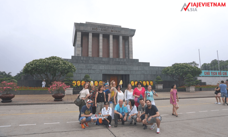 El tiempo ha pasado volando. A lo largo de la mañana hemos visitado muchos lugares interesantes. Ahora nos toca el último destino en nuestro recorrido de hoy: el Mausoleo de Ho Chi Minh, antes de cerrar la Excursiones Hanoi en moto de medio día con un almuerzo de comida típica de Vietnam.