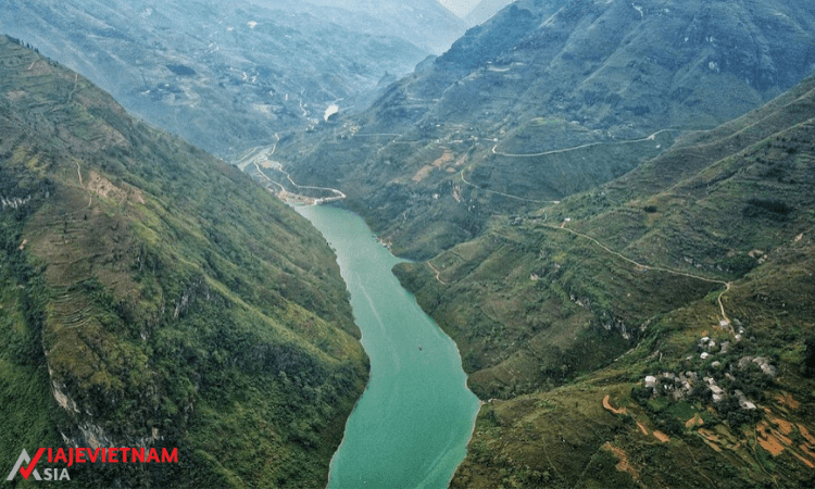 Seguimos el camino para llegar al paso Ma Pi Leng que da vista al río Nho Que. Aguas cristalinas con reflejo de las montañas verdes seguramente que no en muchos sitios se puede contemplar tal vista. Sin embargo, nos espera una vista entre las nubes aún mejor después de subir una cuesta fuera de carretera hasta llegar al pico de una montaña cerca.