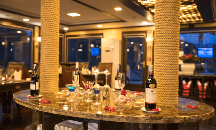 Después del baño vendrá la imagen que los viajes de novios buscan y los poetas se inspiran. Sobre las 17:45h podrán relajarse en la cubierta mientras los últimos rayos de sol dejan la mejor imagen que verán: un atardecer de ensueño. Este atardecer irá acompañado por una clase de estudio de gastronomía vietnamita donde nuestro chef les enseñará los secretos de la mejor cultura gastronómica de toda Asia. Estos platos podrán repetirlos en su casa para llevar todo el sabor de Vietnam con ustedes. Al ver comida tan deliciosa empezará a abrirse el apetito, por ello sobre las 19:30 se servirá bajo la luz de la luna y de las velas la cena donde nuestro personal se ocupará de que sea una de las noches más bonitas que van a disfrutar es sus viajes de lujo. La mejor manera de reposar la cena es relajándose en la cubierta, donde el mayor ruido será la brisa marina después de las motos de Hanoi. Tendrá a su disposición las bebidas del bar y el cálido clima en Vietnam.