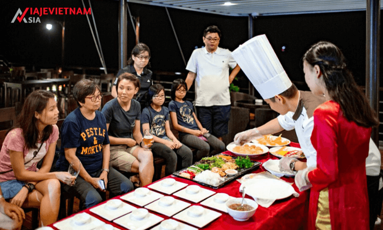 Sobre las 13:15 nuestro chef les preparará, al nivel de los cruceros de lujo, un almuerzo buffet de comida típica de Vietnam para no solo ver, si no saborear Halong. Durante todo momento el barco no se alejará de la bahía ya que estarán realizando una ruta en la que se encontrarán pocos cruceros y estarán alejados de las masas de los turistas.