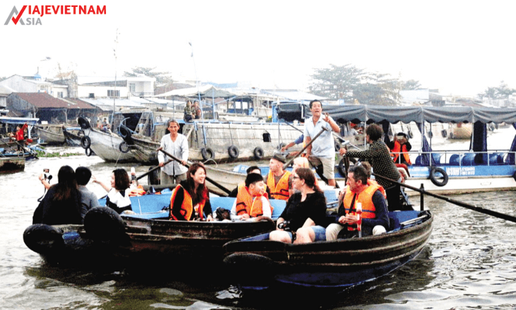 El día anterior habrán visto que la ciudad es muy tranquila, pero con los primeros rayos de sol en esta mañana todo cambiará ya que al embarcarse en un pequeño bote hasta llegar al mercado flotante de Phong Dien verán esta imagen llena de botes en el agua donde están llenos de colores tanto por las especias, frutas, comida u objetos artesanales que traen desde los rincones de Vietnam y Camboya en sus rutas en bote.