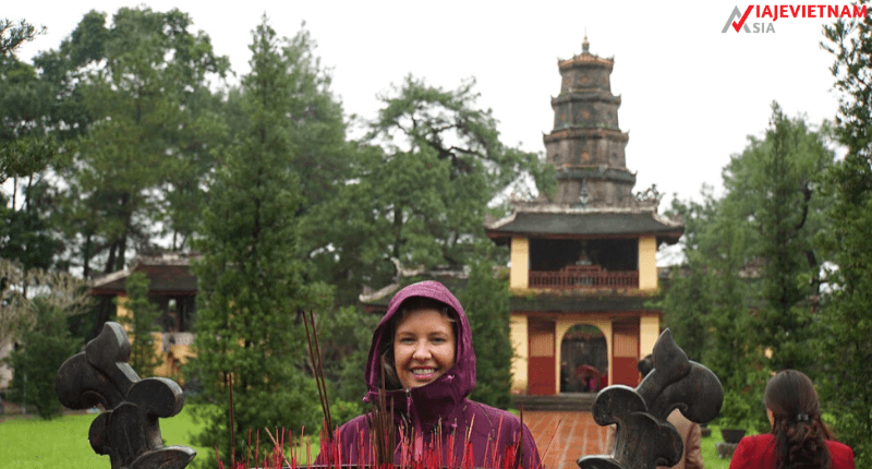 El paseo será relajante por el privado Barco de Dragón en el Río Huong que nos hará sentir de esta romántica y verde ciudad. La Pagoda de los monjes pacifistas Thien Mu (cuyo nombre significa Dama Celestial) en la orilla del río es donde tomaremos las fotos más características e imprescindibles, con uno de los símbolos de Hue.